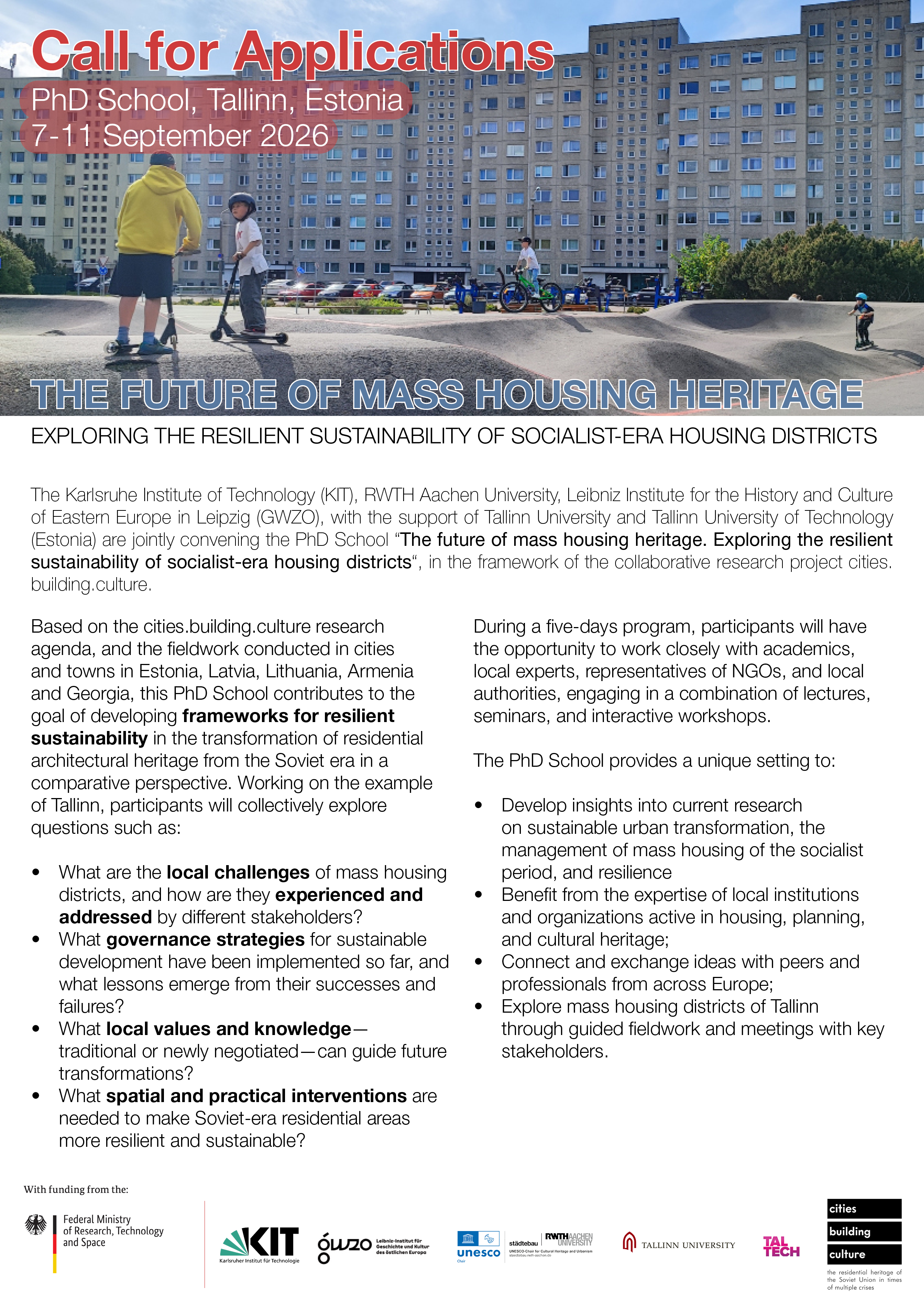The cities.building.culture project, with the support of Tallinn University and Tallinn University of Technology (Estonia) are jointly convening the PhD School “The future of mass housing heritage. Exploring the resilient sustainability of socialist-era housing districts“, in the framework of the collaborative research project cities.building.culture.
